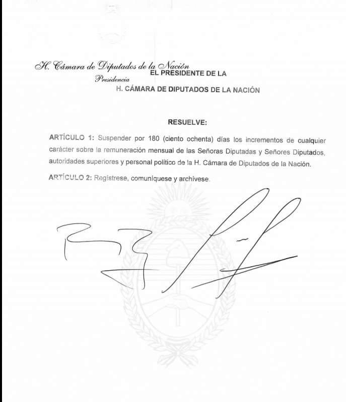El presidente de la Cámara de Diputados, Sergio Massa, decidió congelar por 180 días los sueldos y dietas de todos los diputados nacionales y sus asesores políticos. Idéntica medida administrativa asumirá Cristina Kirchner para la Cámara de Senadores.