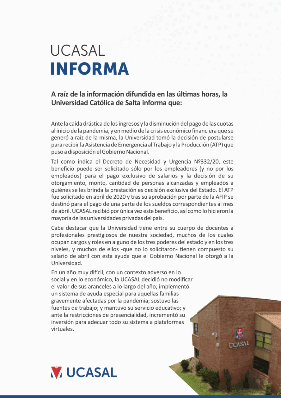 “Ante la caída drástica de los ingresos y la disminución del pago de las cuotas al inicio de la pandemia, y en medio de la crisis económico financiera que se generó a raíz de la misma, la universidad tomó la decisión de postularse para recibir la Asistencia de emergencia al trabajo y la producción (ATP) que puso a disposición el Gobierno Nacional» inicia el comunicado difundido por la universidad.