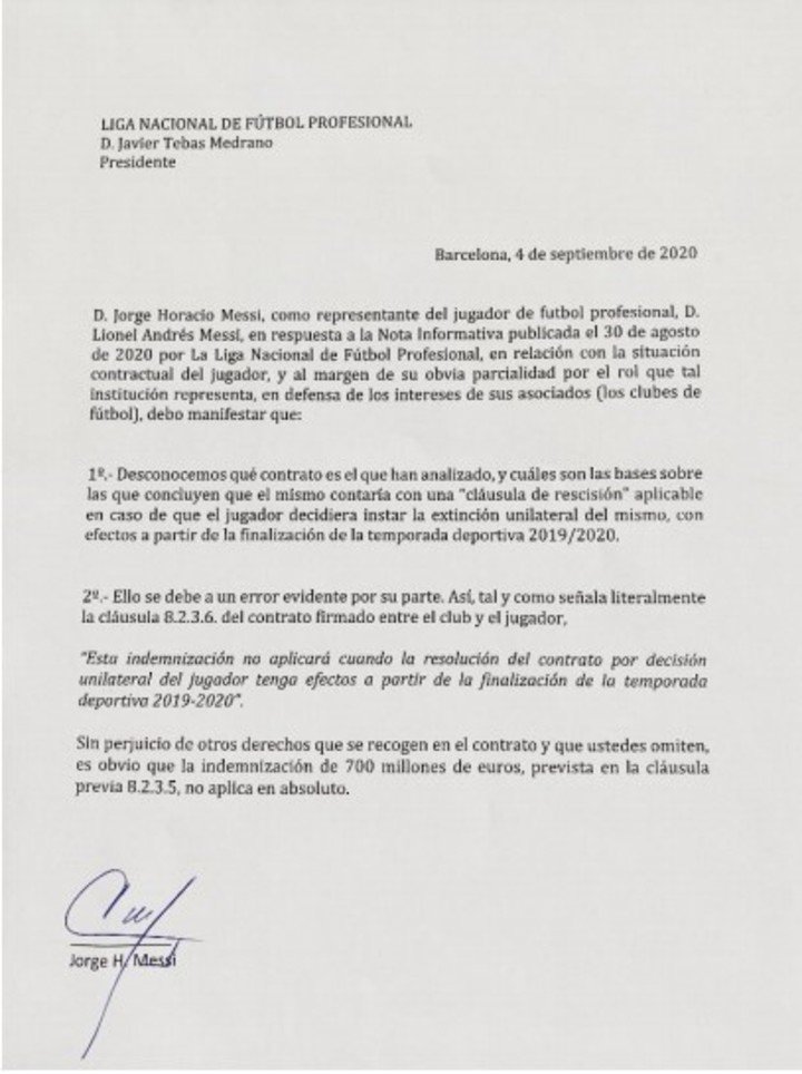 El comunicado tuvo un destinatario claro y explícito, que fue la Liga, aunque también con un mensaje para el club, ya que los dos están en la vereda opuesta a Messi con respecto a la famosa cláusula de 700 millones. Jorge y Leo se refirieron a la posibilidad de terminar un contrato de forma unilateral y al «error evidente» de la Liga, que hace un par de días habló de una vigente «cláusula de rescisión». Ante esto, los Messi respondieron: «Es obvio que la indemnización de 700 millones de euros, prevista en la cláusula previa 8.2.3.5, no aplica en absoluto«.